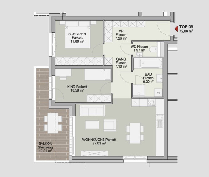 Fliesen, Parkett, Fußbodenheizung, Einbauküche, Wohnküche / offene Küche, Personenaufzug