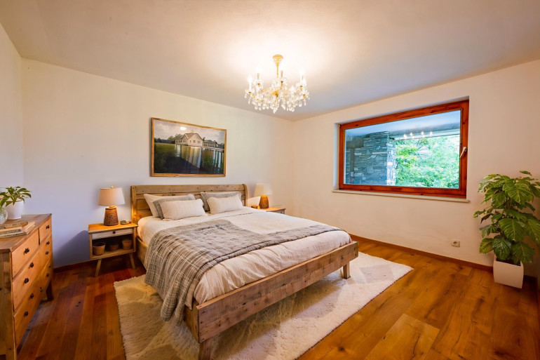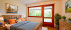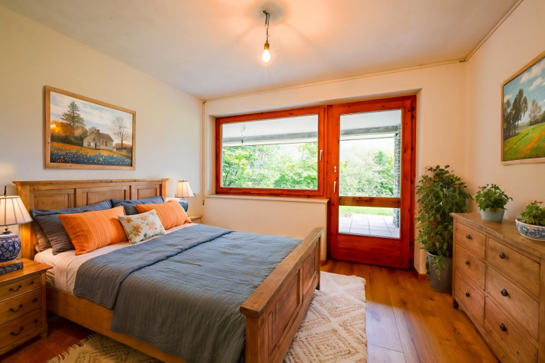 - 3 lichtdurchflutete Schlafzimmer mit Zugang auf eine Terrasse und den Garten, wobei eines die Größe des Wohnzimmers widerspiegelt.