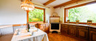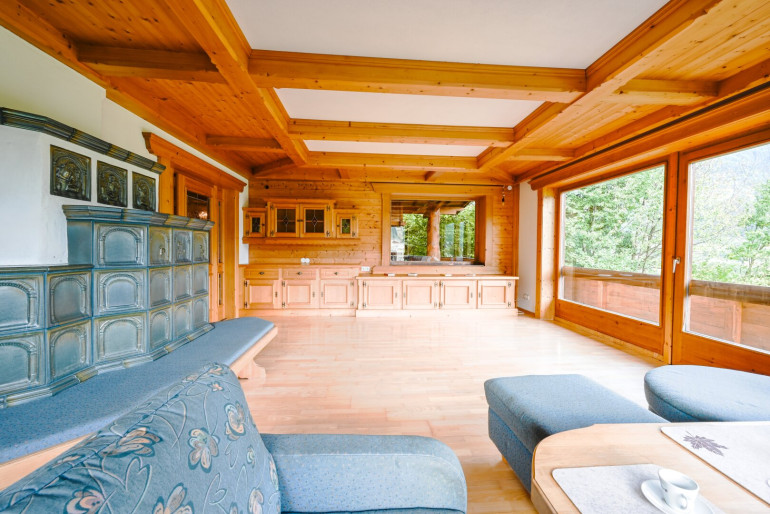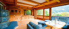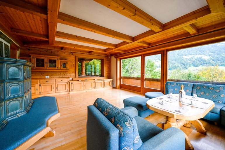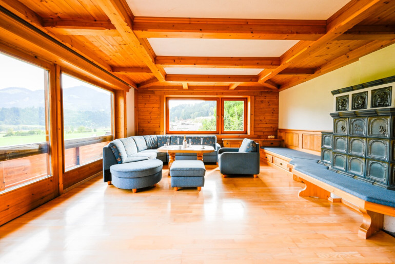 - gemütliches Wohnzimmer (Stube) in hochwertiger Holzausführung mit gemauertem Kachelofen, angrenzender Ofenbank und Sitzmöglichkeit