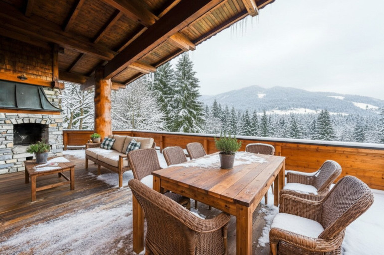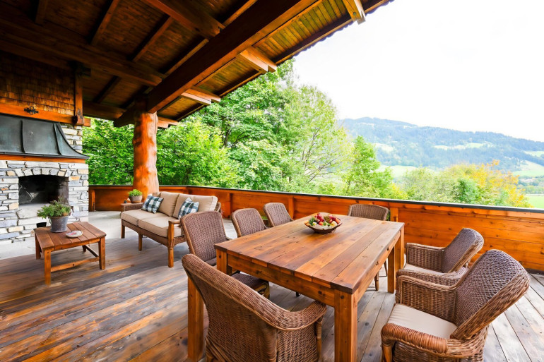- wunderschöne überdachte Terrasse mit Kaminofen im Freien und Blick auf die Hohe Salve und ins Brixental