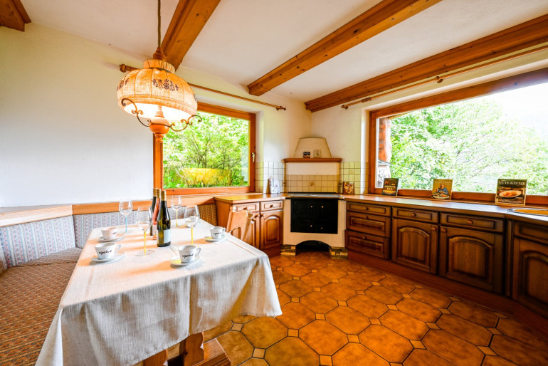 - Vollholzküche ausgestattet mit einem Holzzusatzherd mit angeschlossenem Essbereich und separater Speis