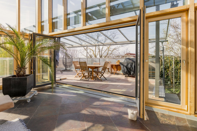 - Stunning glazed living room with multiple exits to the terrace and garden