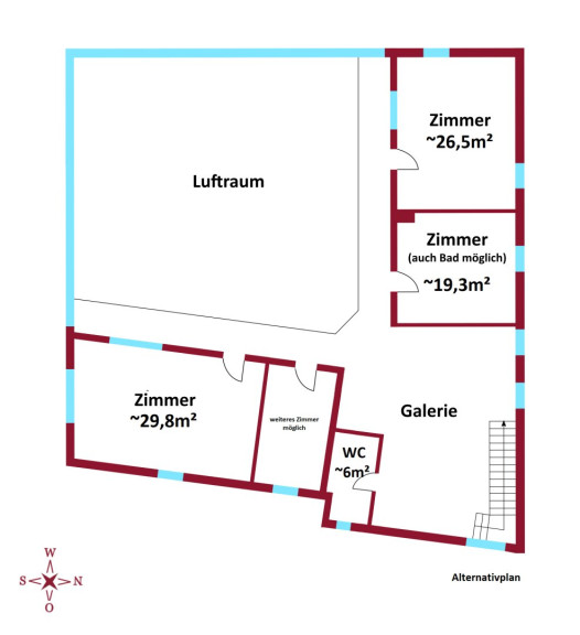 Es besteht zudem die Möglichkeit, durch geringe Adaptierungsarbeiten ein weiteres Zimmer im Obergeschoss dazuzugewinnen. Einen Überblick darüber verschafft Ihnen unser Alternativplan.