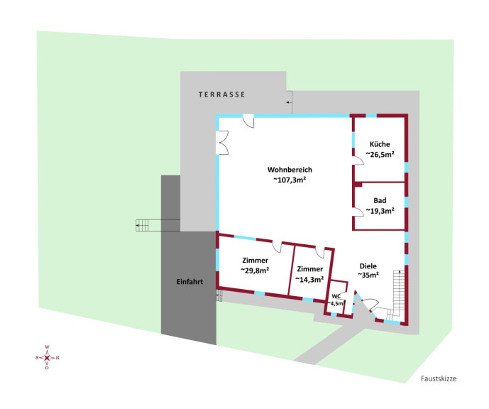 Die Wohnfläche verteilt sich über 2 Etagen auf sehr gut strukturierten ~ 398 m² und beginnt im Erdgeschoss mit einem ansehnlichen Entree, wo eine stilvoll offene Treppe als zentrales Element die beiden Geschosse sowie das Kellergeschoss mit einander verbindet.