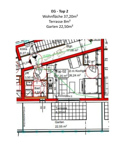 Raumaufteilung Top 02: Die 37,20m² Wohnfläche teilen sich in einen großzügigen Wohn- Schlafraum mit offener Küche und Zugang auf die Terrasse (ca. 8m²) und in den Garten (ca. 22,50m²), Badezimmer mit WC, Vorraum und Abstellraum. Ebenfalls im Kaufpreis enthalten ist eine Autoabstellplatz.