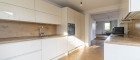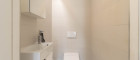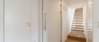 Die hochwertige Einbauküche ist durch eine Schiebetür optisch vom Wohnbereich abgetrennt. Im Erdgeschoß befindet sich außerdem noch ein modernes Badezimmer mit Badewanne und begehbarer Regendusche, eine separate Toilette sowie ein vielseitig nutzbarer Raum. Des weiteren verfügt die Wohnung über eine Bibliothek, welche auch als weiteres Schlafzimmer oder Büro genutzt werden kann.