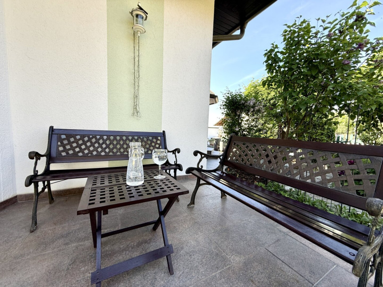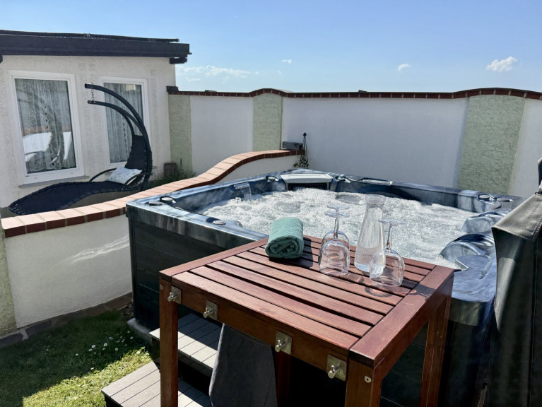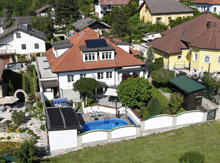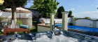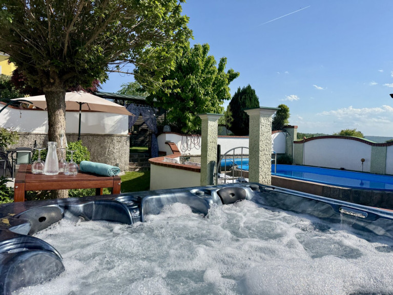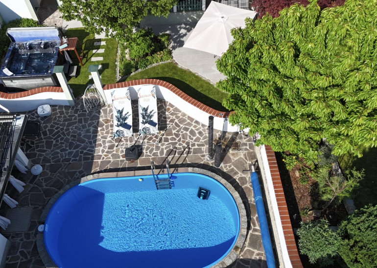 Die vordere Terrasse – mit hochwertigen Granitplatten belegt – ist ideal, um an heißen Tagen im Schatten zu sitzen und dem Plätschern des Brunnens zu lauschen. Auf der Rückseite des Hauses eröffnet sich ein privates Erholungsparadies: Ein beheizter Ovalpool (6 x 3,2 m) mit Luftwärmepumpe, ein neuwertiger Whirlpool, zwei Solarduschen, ein Poolhaus, eine Chill-out-Lounge und eine Terrasse mit Sitzgarnitur und Hollywoodschaukel machen aus dem Garten ein echtes Outdoor-Wohnzimmer. Absolute Privatsphäre ist durch die uneinsichtige Gestaltung garantiert.
