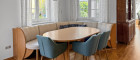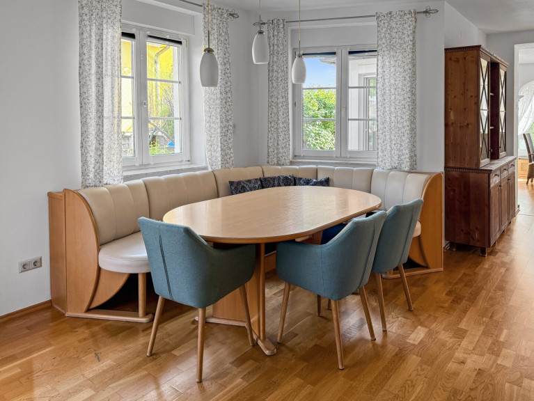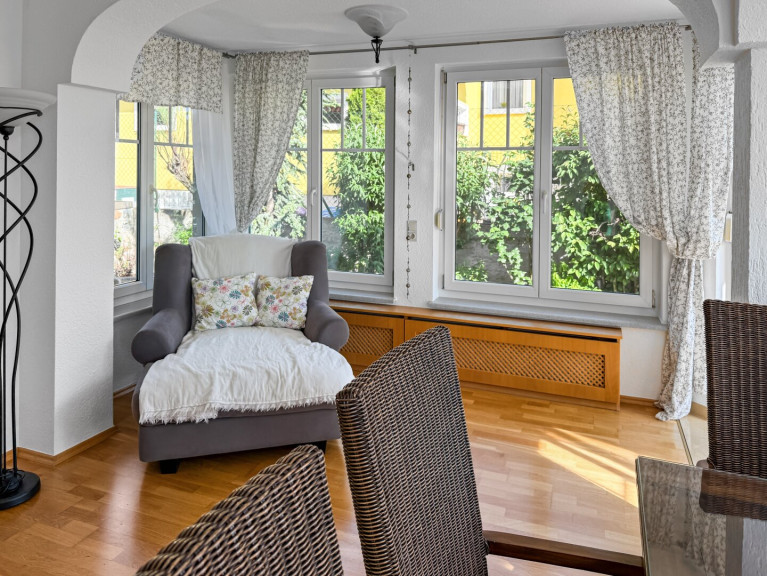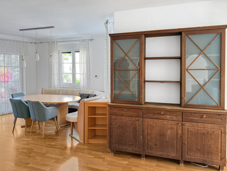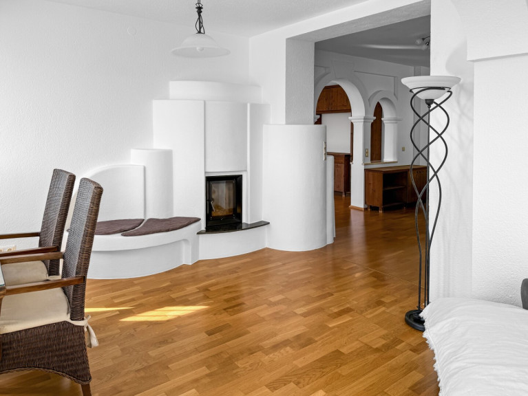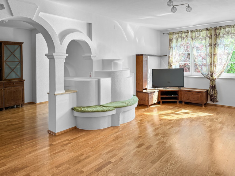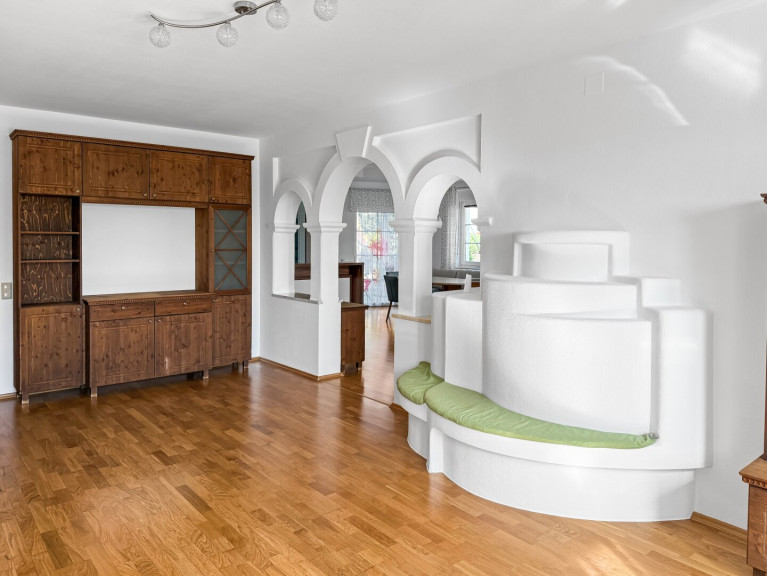 Ein stilvoller Kachelofen mit integrierter Sitzbank zieht sich über zwei Räume und sorgt in der kalten Jahreszeit für wohlige Wärme und ein besonderes Ambiente. Das großzügige Wohnzimmer eröffnet einen atemberaubenden Ausblick in den Garten und schafft ein lichtdurchflutetes Wohnambiente, das zum Verweilen einlädt.