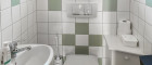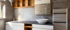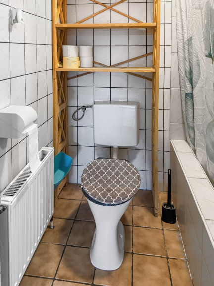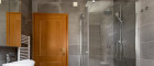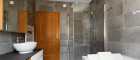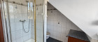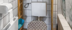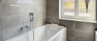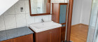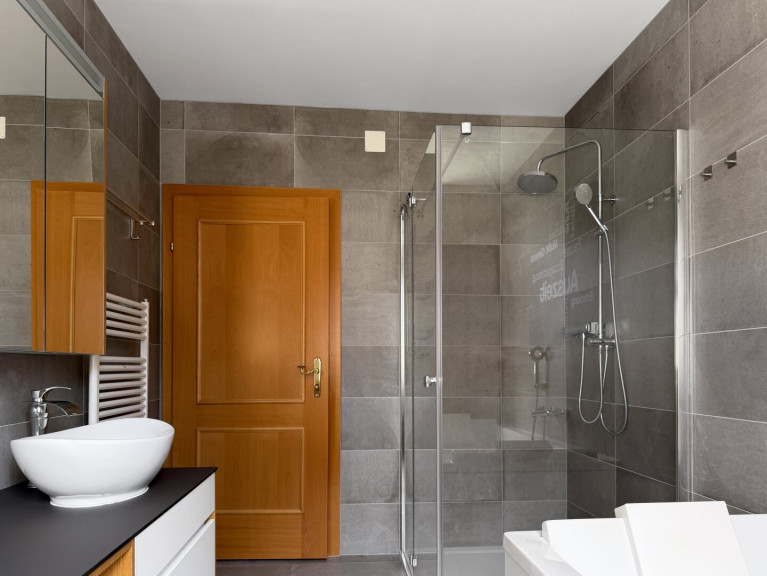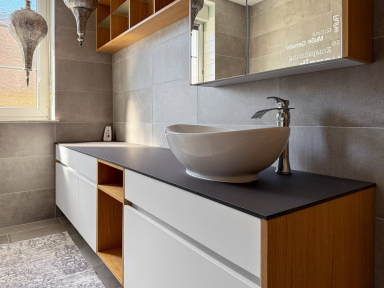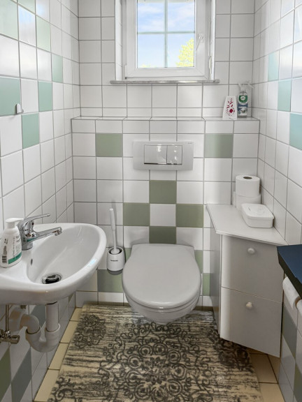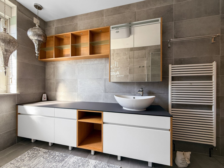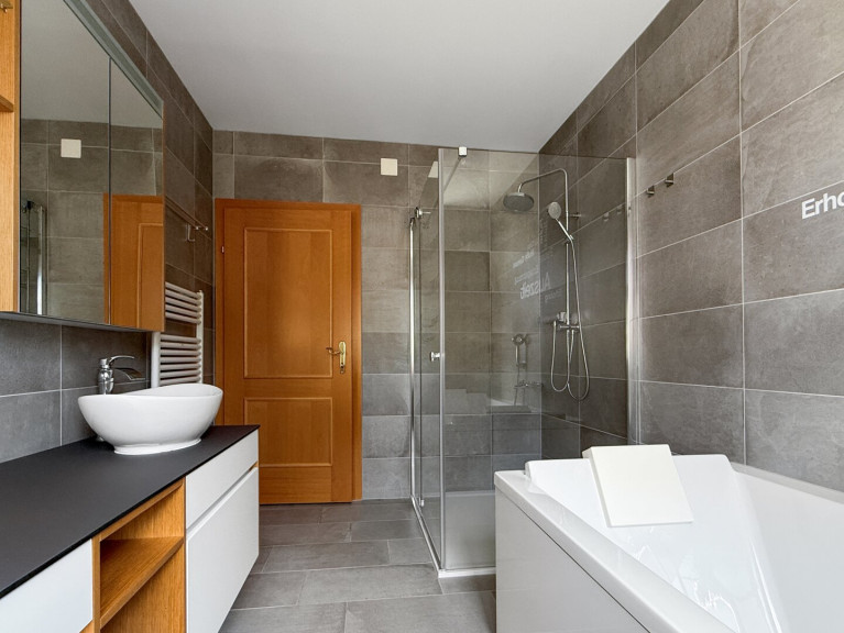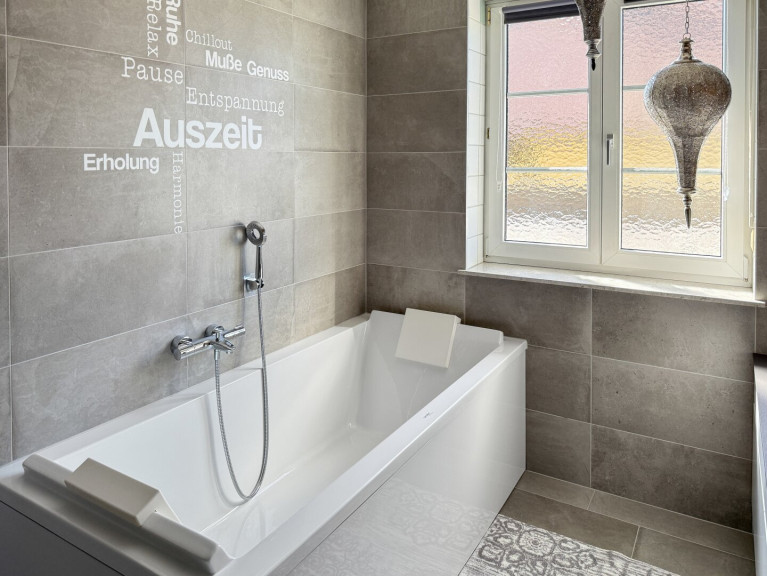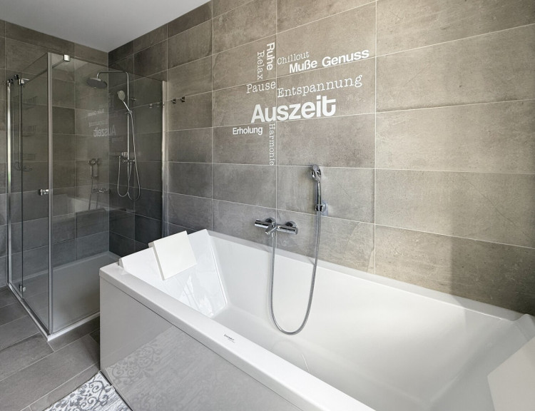 Das Badezimmer im Erdgeschoss wurde 2022 vollständig erneuert und luxuriös ausgestattet. Hier erwartet Sie eine großzügige Dusche, eine elegante Badewanne für zwei Personen, hochwertige Hans Grohe Armaturen und Sanitärelemente von Duravit. Ein separates WC komplettiert das Raumangebot dieser Etage.