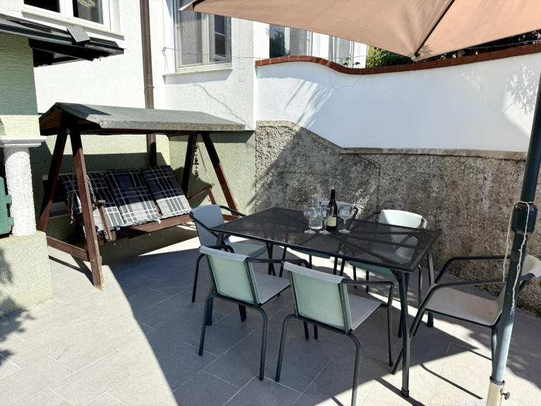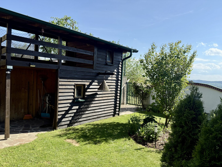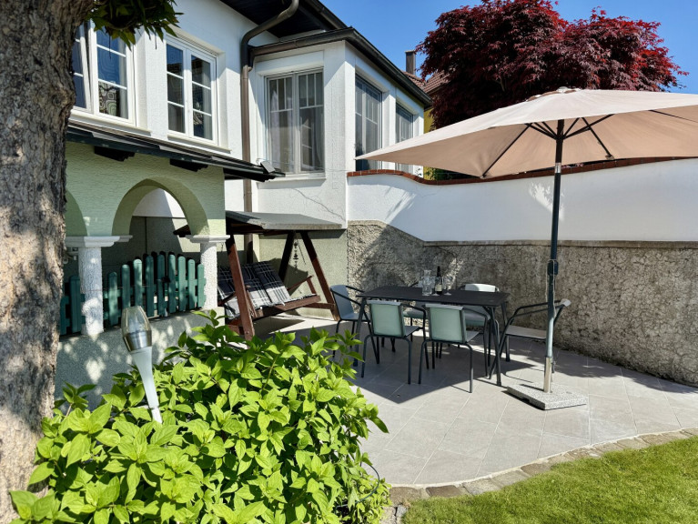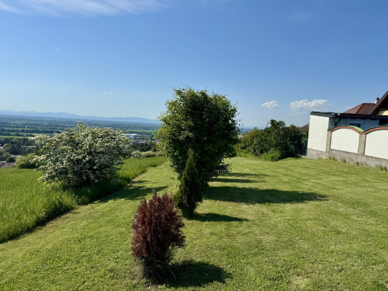 Im hinteren Bereich des Gartens führt eine kleine Tür direkt hinaus in die Natur – von hier aus gelangen Sie unmittelbar auf idyllische Spazierwege mit herrlichem Ausblick auf das Wiener Becken und den Schneeberg; nach nur zwei Gehminuten erreichen Sie ein liebevoll platziertes Bankerl, das zum Innehalten, Durchatmen und Genießen der einzigartigen Landschaft einlädt.