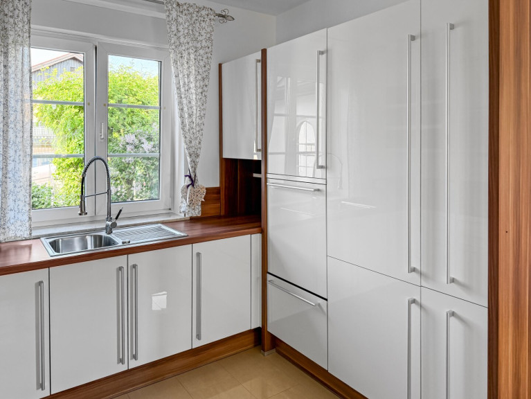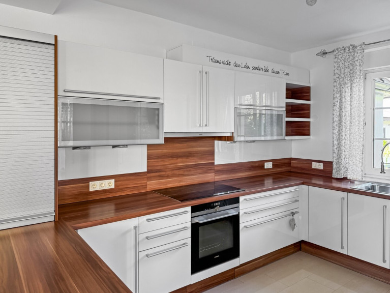 Bereits beim Betreten des Hauses spürt man die Großzügigkeit und das durchdachte Raumkonzept. Vom zentralen Vorraum aus sind alle Bereiche des Erdgeschosses bequem erreichbar. Der offene Wohn- und Essbereich ist das Herzstück des Hauses – hell, einladend und ausgestattet mit einer großen, modernen Küche, die keine Wünsche offenlässt. Der hochwertige Küchenbereich ist neuwertig und perfekt für gesellige Abende oder genussvolle Familienmahlzeiten.