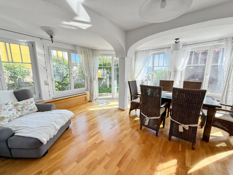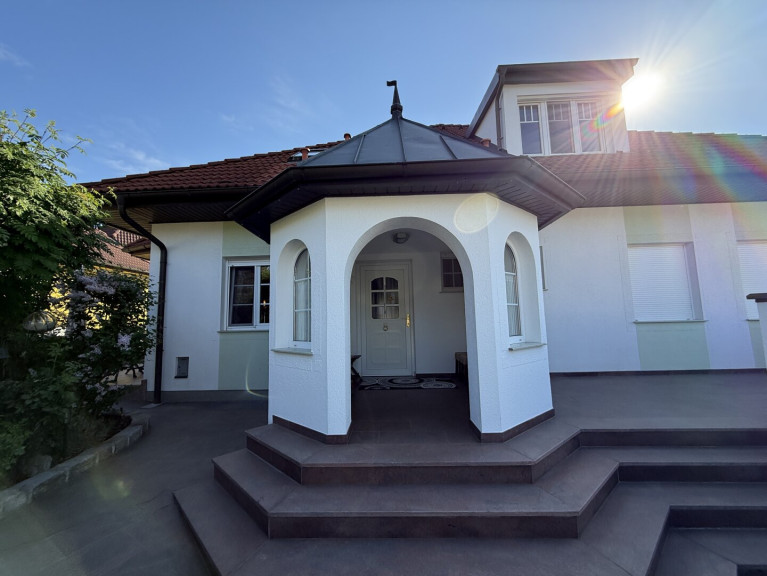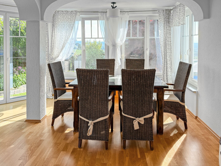 Dieses außergewöhnliche Haus steht auf einem großzügigen Grundstück mit 735 m² Fläche mit unverbaubarem Fernblick. Direkt hinter dem Haus beginnen Spazierwege, Wälder und unberührte Natur – perfekt für alle, die die Stille lieben und gleichzeitig das Besondere suchen. Die rund 291m² Wohnfläche erstrecken sich über Erd- und Obergeschoss, hinzu kommt ein voll ausgebauter Keller mit beeindruckenden 206 m² inkl. 4 Garagenplätzen. Die Raumaufteilung bietet flexible Nutzungsmöglichkeiten – ob als luxuriöses Einfamilienhaus oder als stilvolles Zuhause für mehrere Generationen.