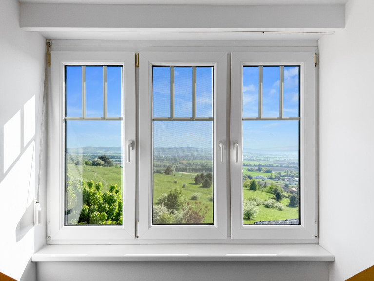 Kunststoffenster mit manuellen Rollos und Fliegengitter