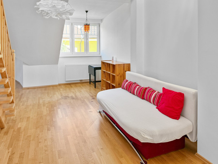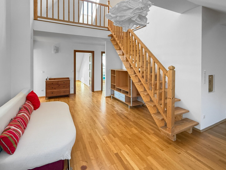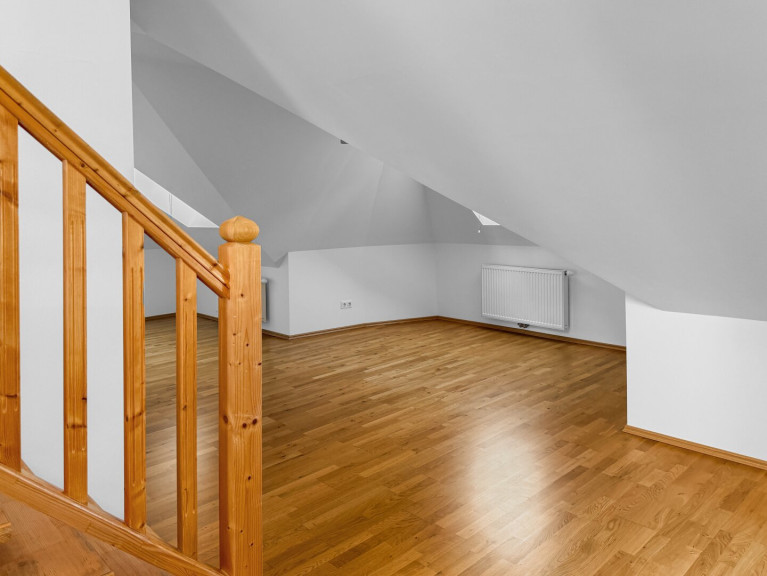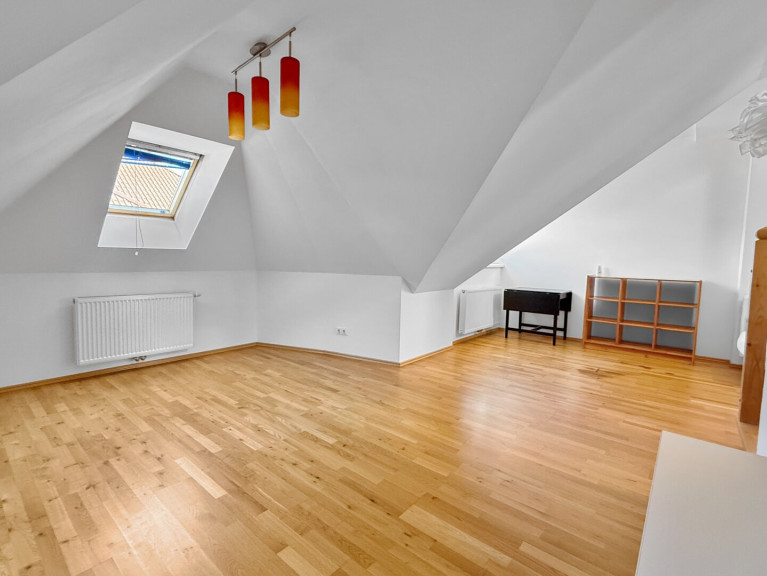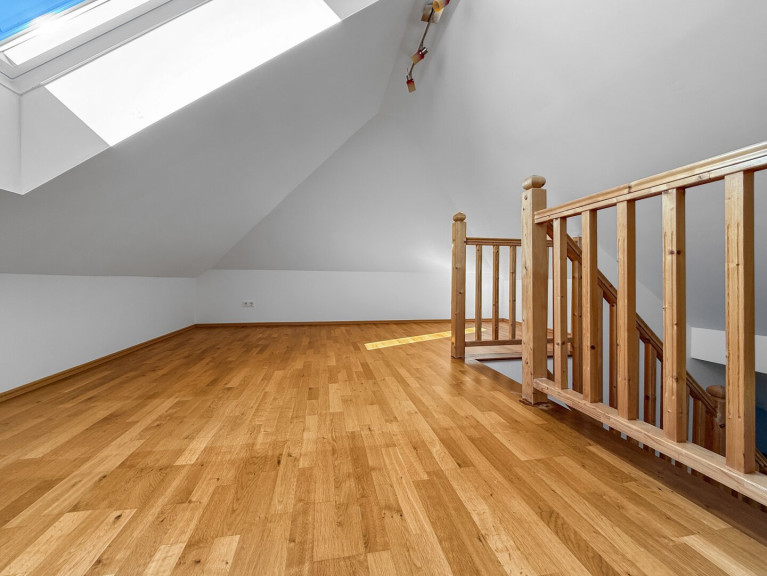 Vom Obergeschoss führt eine stilvolle Holztreppe in den ausgebauten Mansardenbereich, der zusätzlichen Raum für Hobbies, Gäste oder kreative Ideen bietet. Das gesamte Haus wurde 2024 frisch ausgemalt und präsentiert sich innen wie außen in einem außergewöhnlich gepflegten Zustand.