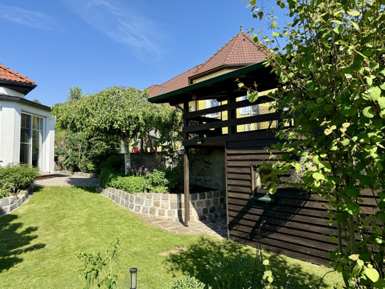 Ein weiterer Pluspunkt: Der Garten ist von allen Bereichen des Hauses aus bequem erreichbar – vom Wintergarten, dem Keller oder der Garage aus. Ein praktisches Gartenhäuschen rundet das Angebot ab und bietet ausreichend Platz für Geräte und Zubehör.