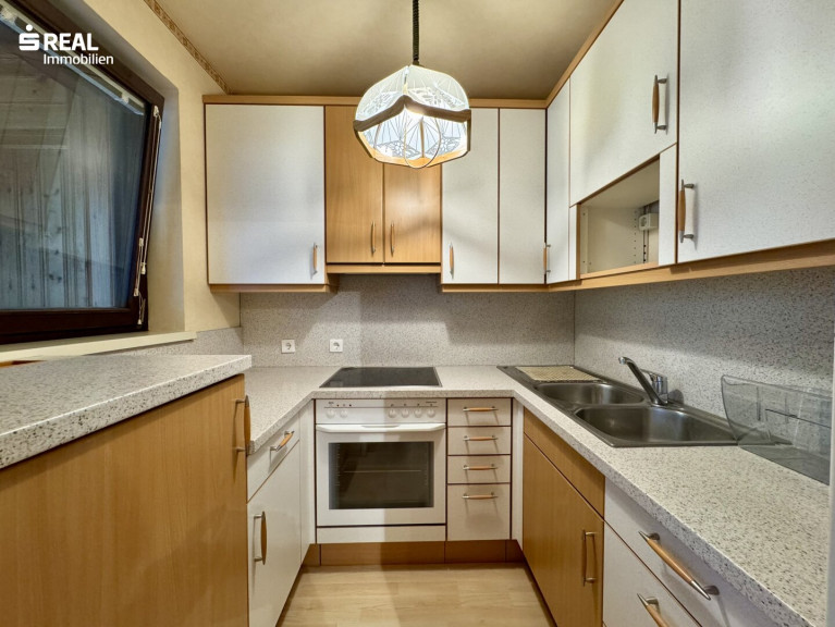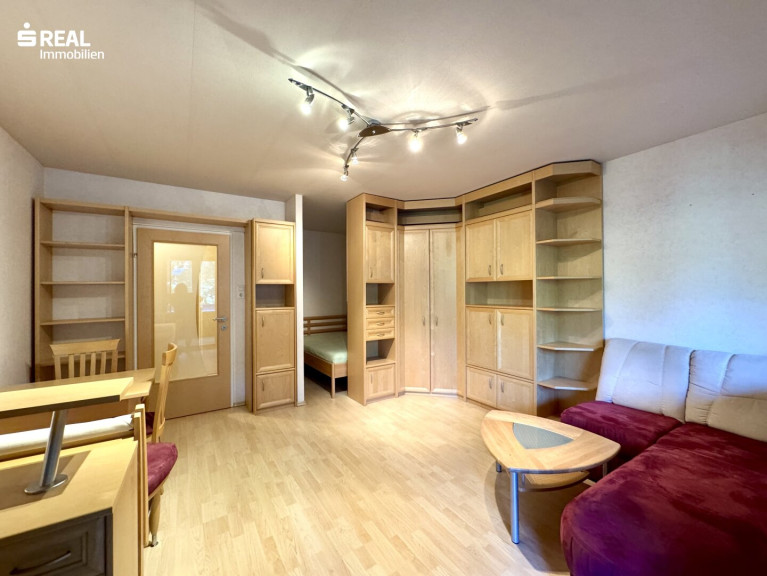 Geschickt aufgeteilt findet man hier einen Vorraum, den Wohn- Schlafraum mit Ausgang auf die 12 m² große verglaste Loggia, eine mit Schiebetüre abgetrennte Küche, das Badezimmer mit Wanne und Platz für die Waschmaschine, separate Toilette und auch einen bis obenhin verbauten Abstellraum. Das Wohnzimmer bietet ausreichend Platz für ein gemütliches Sofa, einen kleinen Essplatz, praktische Einbauschränke und Regale und eine versteckte Nische wo das Bett untergebracht ist. Die 12 m² große verglaste Loggia bietet zusätzlichen Wohnraum, ein bisschen Farbe, ein moderner Bodenbelag und schon hätte man ein freundliches Plätzchen mit Blick ins Grüne.
