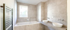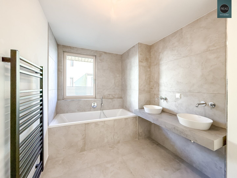 - 1 Badezimmer mit Doppelwaschbecken, Badewanne, Dusche, Handtuchheizkörper sowie einem Fenster