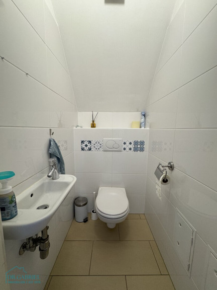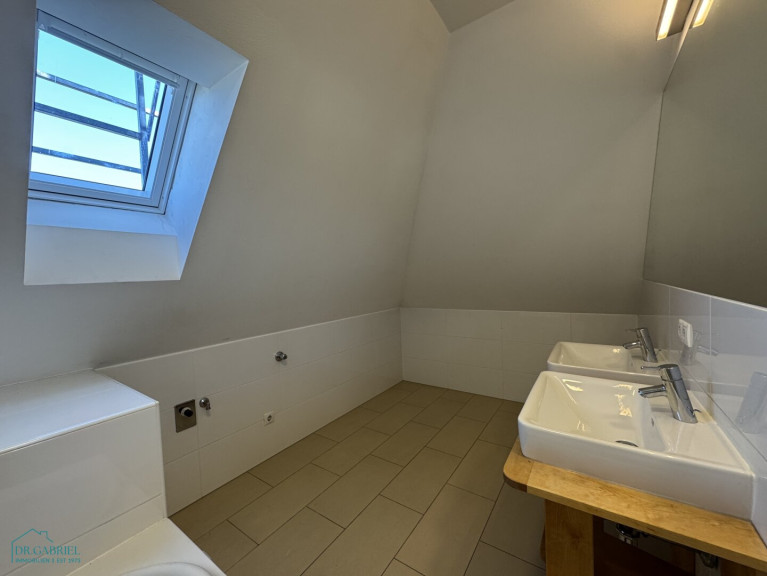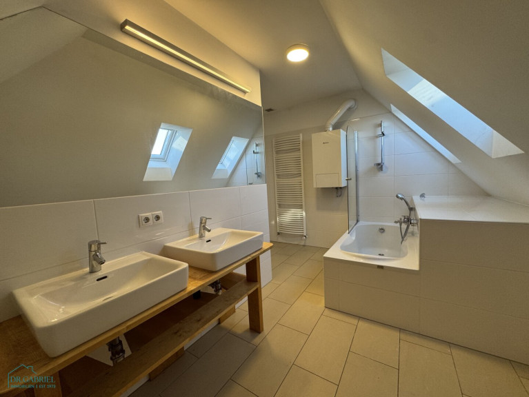 großer Vorraum, Wohnküche mit Ausgang auf die südseitige Terrasse, ein weiteres Zimmer mit Ausgang auf die hintere Terrasse, das als Wohnzimmer oder als Schlafzimmer genutzt werden kann, ein weiteres Schlafzimmer und ein kleines Zimmer, ideal für Homeoffice, ein großes Bad mit Doppelwaschbecken, Badewanne und Waschmaschinenanschluss, Gäste WC.