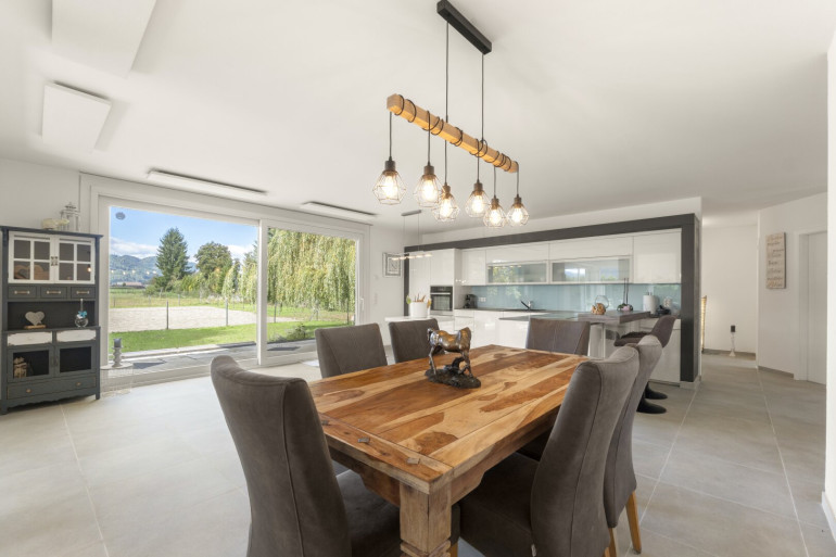 offener Wohn-, Ess- und Küchenbereich mit direktem Ausgang auf die Terrasse