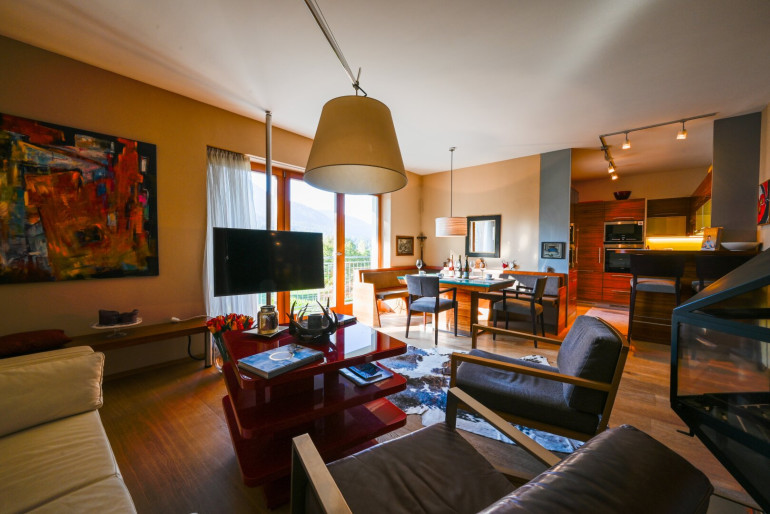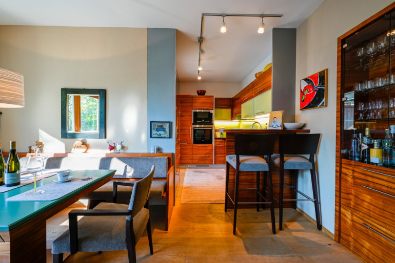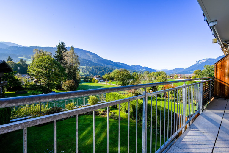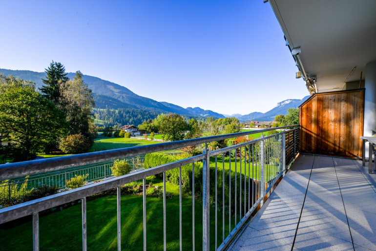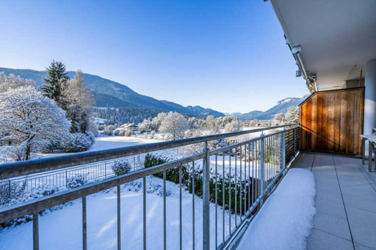 Der offene Wohn-, Koch- und Essbereich sorgt mit seiner Einrichtung für ein modernes und angenehmes Raumgefühl. Die perfekt ausgestattete Küche mit Geräten der Firma Siemens ist mit einer großen Terrassentür ausgestattet, die den Weg zur 15 m² großen Terrasse/Balkon freigibt – ideal, um den freien Blick auf den Hausberg Brandstadl und die umliegende Bergwelt wie den Wilder Kaiser, Pölven und die Hohe Salve zu genießen. Die Terrasse ist perfekt, um den ganzen Tag in der Sonne zu entspannen. Im Anschluss zur Küche befindet sich ein Abstellraum, der somit den nötigen Stauraum bietet, sowie mit einem Waschmaschinenanschluss ausgestattet ist. Der Holzboden sorgt für eine angenehme Atmosphäre.
