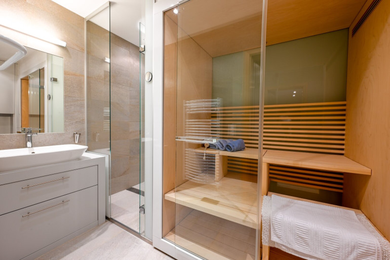 Fliesen, Parkett, Fußbodenheizung, Wohnküche / offene Küche, Personenaufzug, Bad mit Fenster, Dusche, Parkplatz, Tiefgarage, Sauna, Wasch/Trockenraum