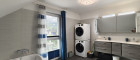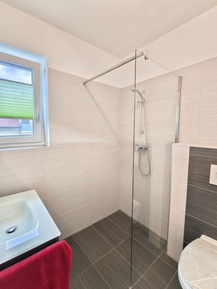 Ebenfalls im Erdgeschoss befinden sich ein Vorraum, ein kleines Bad mit Dusche und WC, ein Abstellraum, der Heiz-/Technikraum sowie ein separates Zimmer, das sich perfekt als Gästezimmer, Büro oder Kinderzimmer eignet – ebenfalls mit Zugang zum Garten.