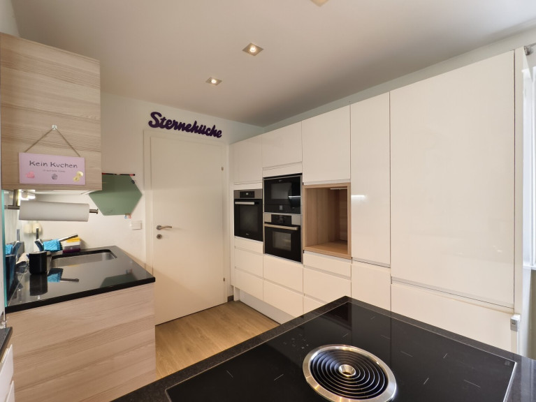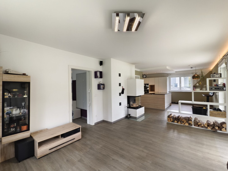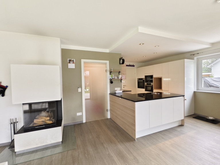 Im Erdgeschoss erwartet Sie ein großzügiger, offener Wohn- und Essbereich mit moderner Küche und direktem Zugang zur sonnigen Terrasse und zum Garten – ideal für gemütliche Stunden mit Familie und Freunden. Der Kachelofen sorgt in der kalten Jahreszeit für behagliche Wärme und Wohlfühlatmosphäre.
