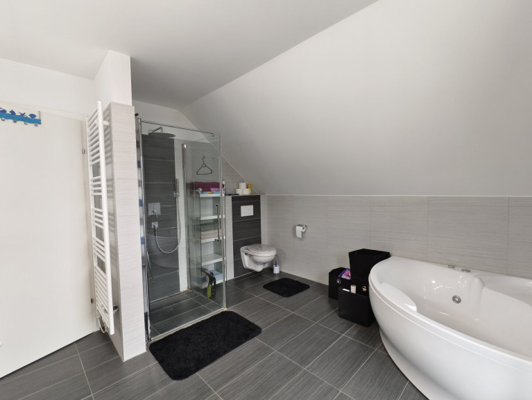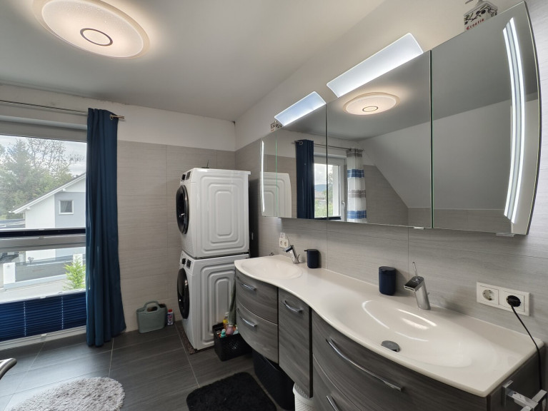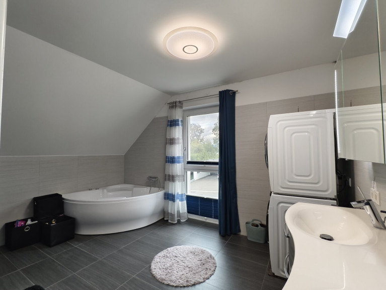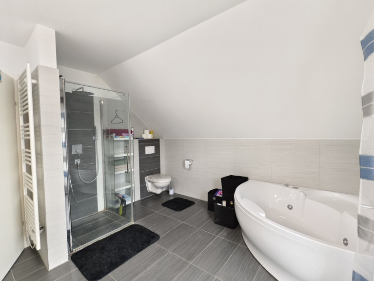 Im Obergeschoss befinden sich drei Schlafzimmer, zwei davon mit Balkonzugang, sowie ein großes, helles Badezimmer mit Dusche, Badewanne und WC.