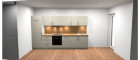 Die Wohnung wird mit einer hochwertigen Einbauküche ausgestattet: Fronten in elegantem Platingrau, schwarze Metallgriffe und eine Arbeitsplatte in Chalet Eiche sorgen für ein modernes, harmonisches Gesamtbild.