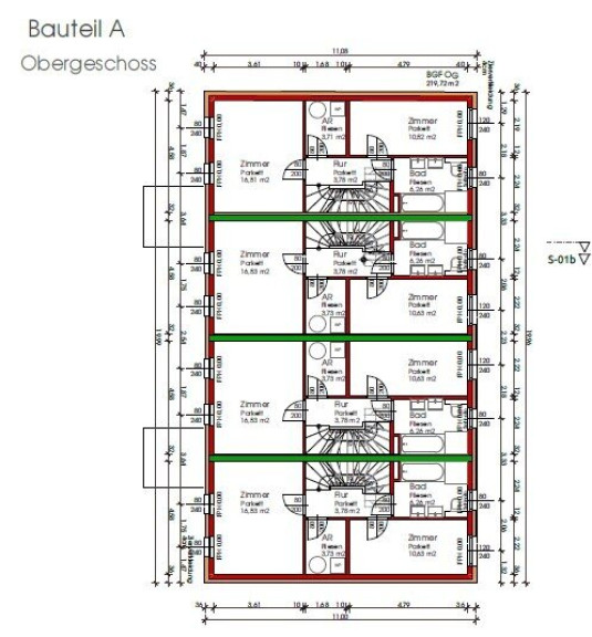 Zusätzlich gibt es noch 16 PKW-Stellplätze im Freien vor den Häusern.