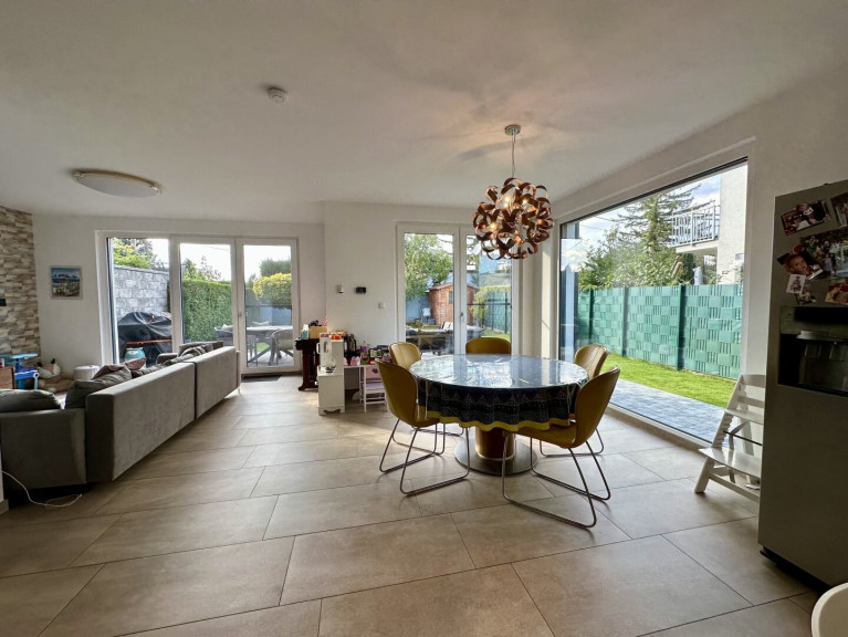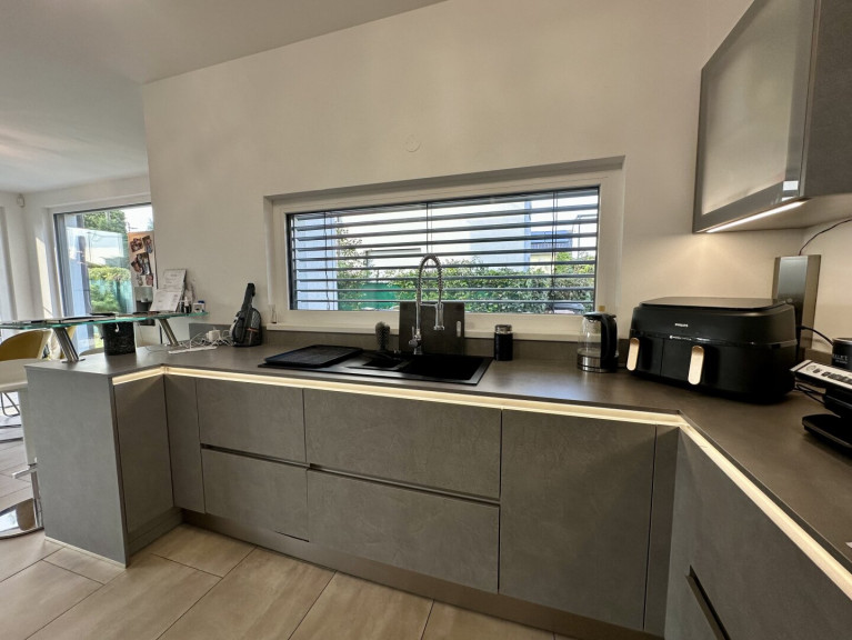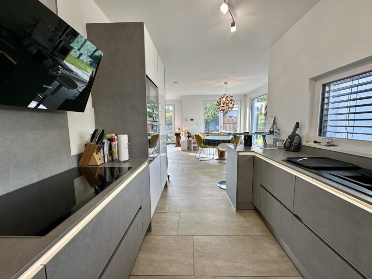 Die offene Wohnküche ist das Herzstück Ihres neuen Zuhauses. Hier fließen Kochen, Essen und Geselligkeit zusammen. Ausgestattet mit modernen Fliesen, sorgt die Fußbodenheizung für ein angenehmes Raumklima, egal zu welcher Jahreszeit. Von hier aus betritt man auch die großzügige Terrasse und den gepflegten Garten.