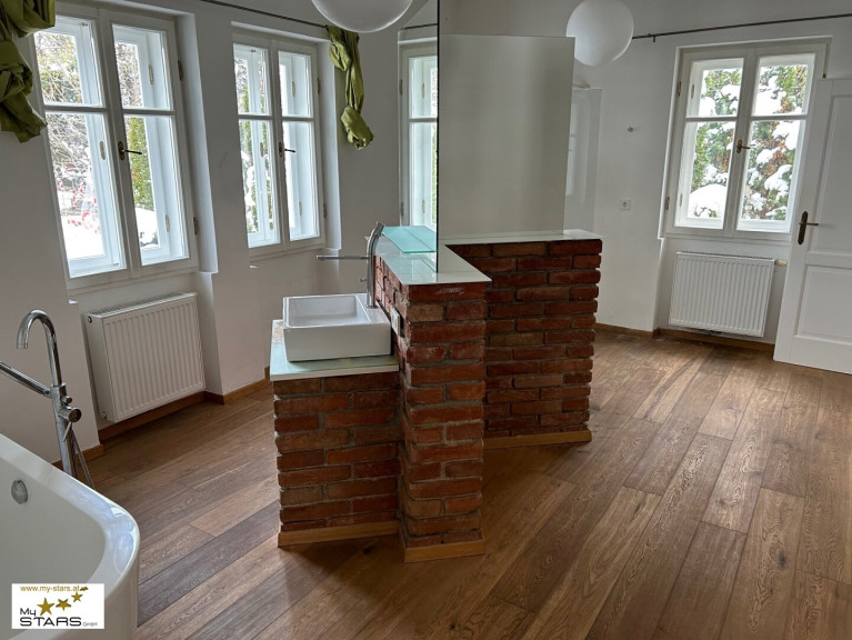 Über die stilgerechte Eichenholztreppe gelangen Sie in das Obergeschoß, wo der großzügig gestaltete Schlafraum mit Ankleide, das hochwertige Badezimmer, ausgestattet mit den einzigartigen Waschtischen, einer offen gestalteten Dusche sowie eine freistehende Badewanne zum Verweilen und Entspannen einladen. Des Weiteren befindet sich noch im Obergeschoß ein Arbeits/Kinderzimmer mit Bad sowie eine separate Toilette. Die Böden sind aus hochwertigem Parkett.