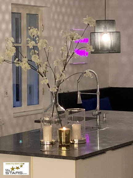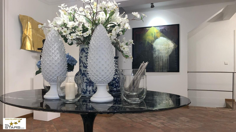 Durch die offen gestaltete Eingangshalle gelangen sie in den großzügigen Wohnbereich mit offener Küche. Dem Stil getreu zieren auch hier der alte Ziegelboden, historisch nachgebildete Flügeltüren sowie aufwendig rekonstruierte Stuckarbeiten. Der Wohnbereich bietet ebenfalls Zugang zur charmanten ca. 5 m² Terrasse, von welchen man einen herrlichen Blick in den eigenen, großzügigen ca. 1.000 m² großen Garten genießen kann.