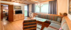 Rechts entlang des Flurs gelangt man in die Küche sowie das daran anschließende Wohnzimmer – beide Räume bieten direkten Zugang zur westseitig ausgerichteten Loggia mit Blick ins Grüne und auf die Berge.