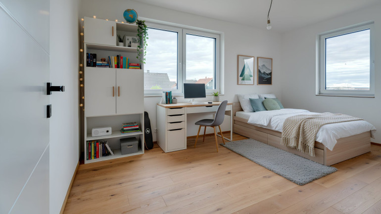 Das Obergeschoß besticht durch 3 Zimmer (Schlafzimmer, Kinderzimmer, Büro, Gästezimmer,...), einen Bad mit WC sowie einen Schrankraum.