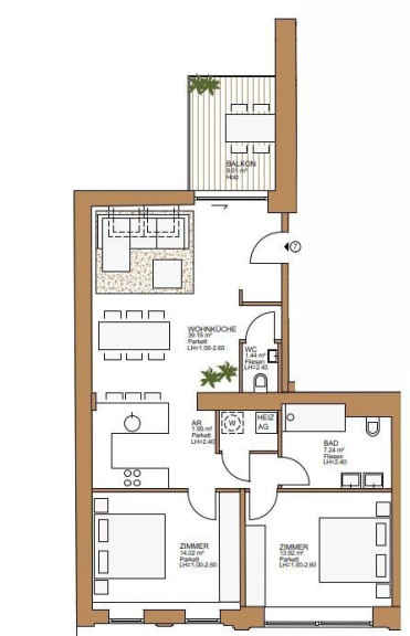 Die Wohnung überzeugt durch eine durchdachte Raumaufteilung. Ein besonderes Highlight ist der Balkon, der zum Entspannen im Freien einlädt und eine grüne Oase mitten in der Stadt bietet. Eine Klimaanlage ist ebenfalls vorhanden.
