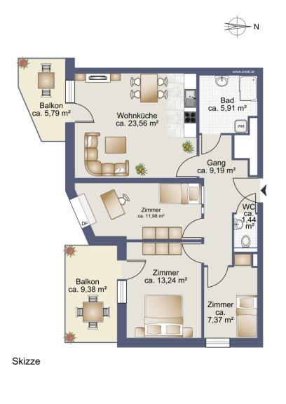 - zwei Schlafzimmer in angenehmer Größe – eines davon mit direktem Ausgang auf den zweiten Balkon