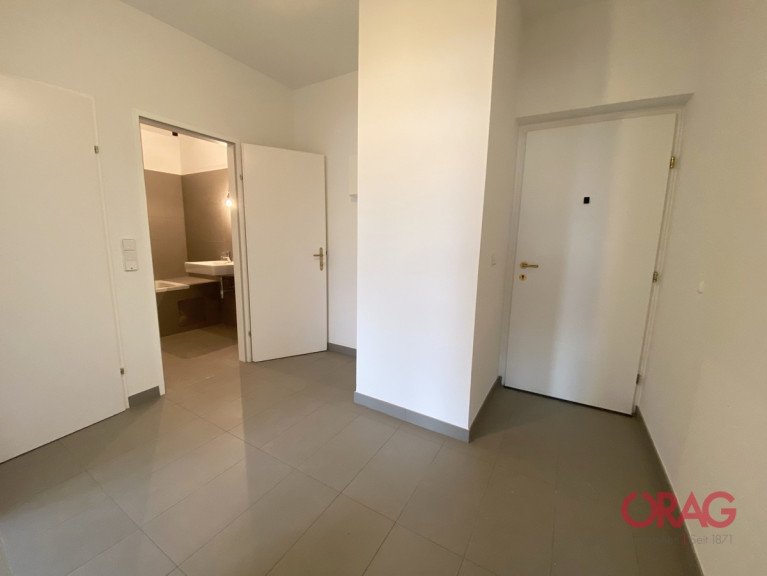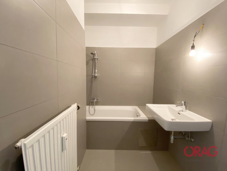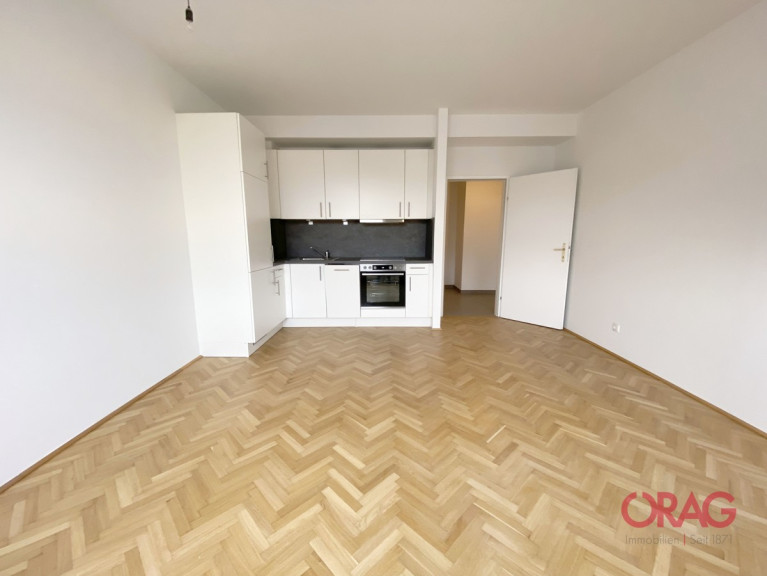 einladendes Vorzimmer, ostseitiges Wohnzimmer mit offener, modern ausgestatteter Einbauküche, Schlafzimmer, elegantes Badezimmer mit Wanne und Waschmaschinenanschluss sowie ein extra WC.