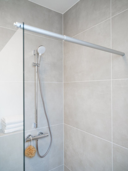 - Elegantes Badezimmer mit Walk-in-Dusche und WC.