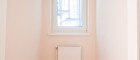 Im hinteren Bereich der Wohnung befindet sich eine separate Küche mit Platz für einen gemütlichen Essbereich, ein separates WC mit Handwaschbecken, ein Badezimmer mit Doppelwaschtisch, Dusche und Handtuchheizkörper und das großzügige Schlafzimmer.