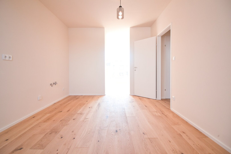 Der Vorraum bietet genug Platz zum Ankommen und für eine Garderobe. Geradeaus geht es in das sehr großzügige Wohnzimmer der Wohnung. Durch die große Fensterfront ist der Raum sehr freundlich und gemütlich. Hier öffnet sich der Blick in Richtung einer der beiden Terrassen. Diese befindet sich auf Wohnebene und ist etwas mehr als 12 m² groß. Außen führt eine gewendelte Treppe zur einzigartigen Dachterrasse, die mit über 22 m² viel Privatheit und einen herrlichen Blick auf die Gloriette bietet.