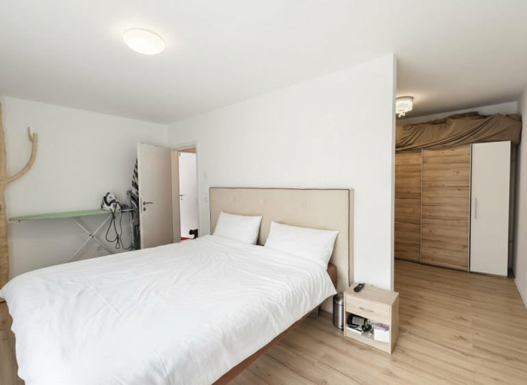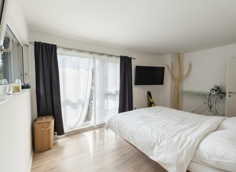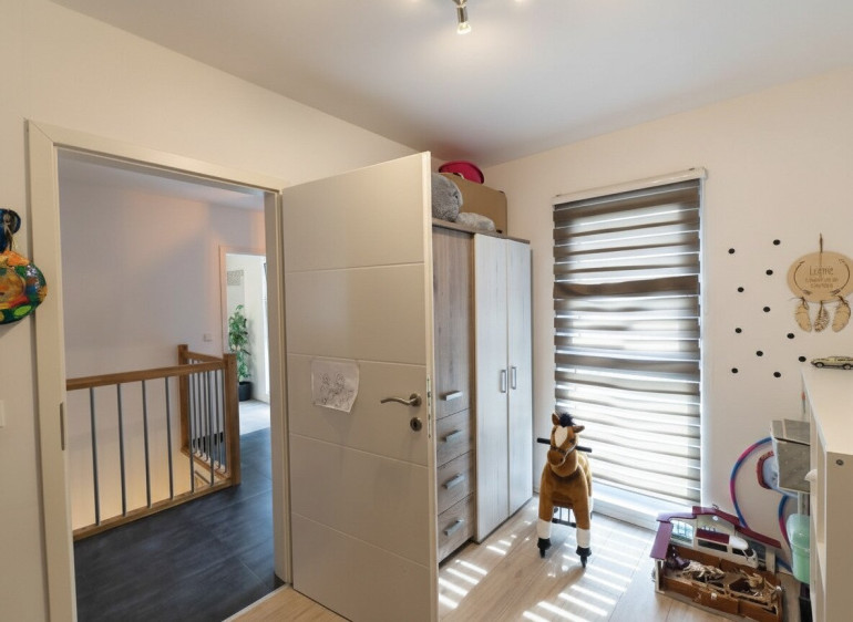 Über die Treppe gelangt man ins Obergeschoss, das die privaten Rückzugsräume beherbergt. Hier befinden sich drei Schlafzimmer, eines davon mit einem begehbaren Kleiderschrank, sowie ein großzügiges Badezimmer mit Badewanne, Dusche und WC.