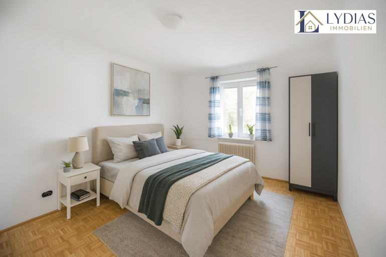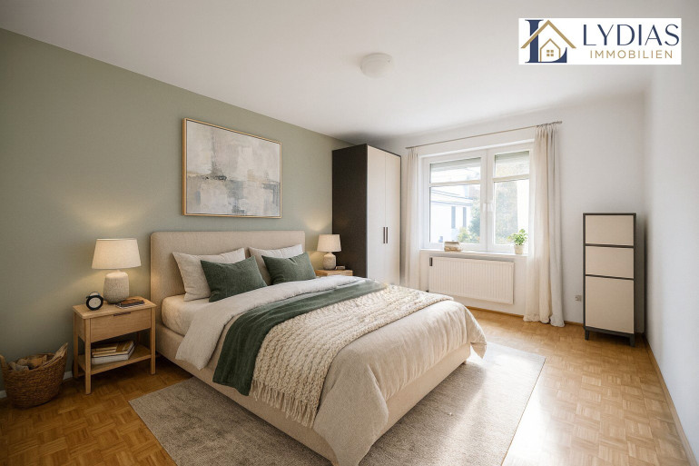 Zur Information: Die Abbildung des Wohnzimmers und der beiden Zimmer wurde virtuell gestaltet und dient der Veranschaulichung. Die Originalfotos befinden sich ebenfalls im Inserat.