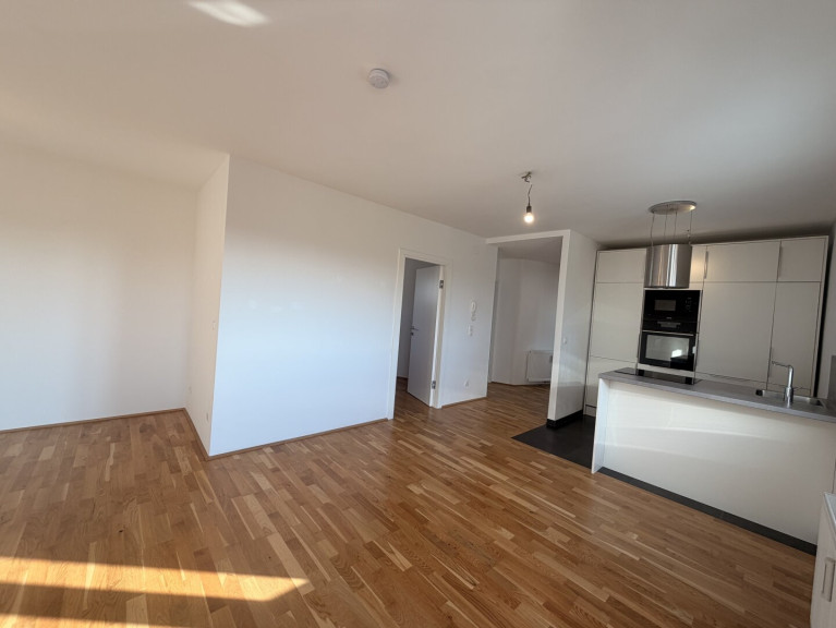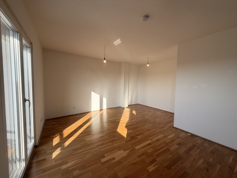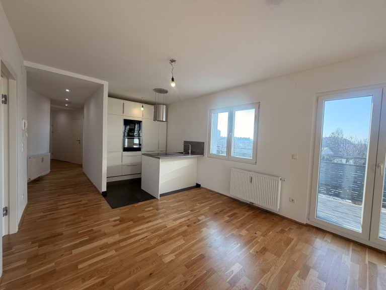 Wohnzimmer mit offener Küche und Zugang zur Terrasse, Schlafzimmer, Arbeitszimmer, Vorzimmer,
