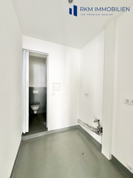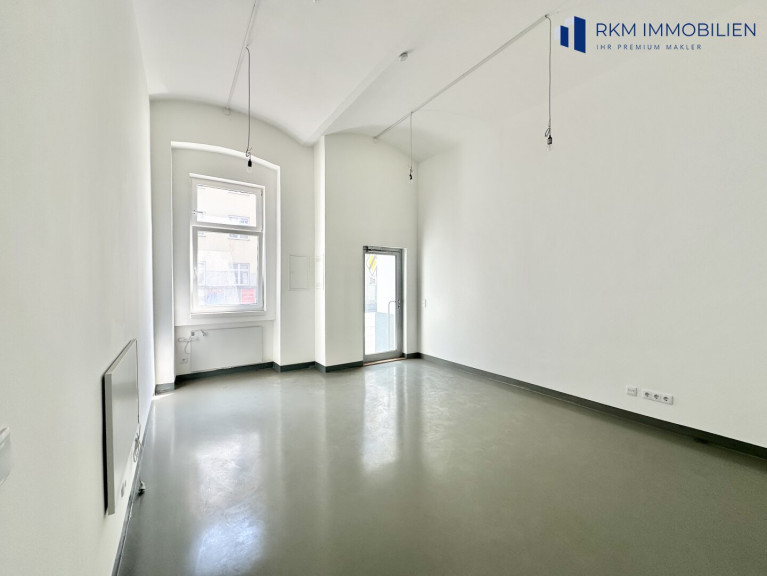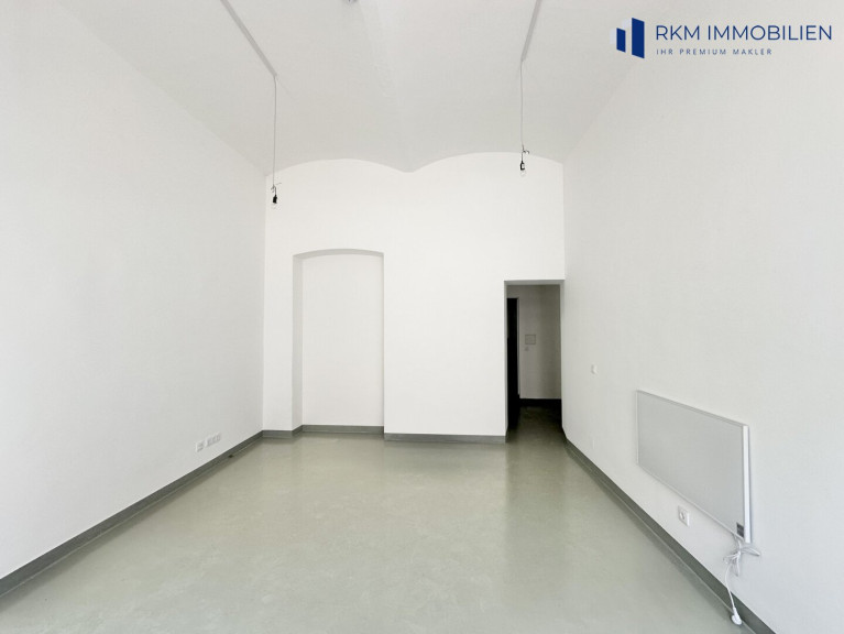 Es besteht aus einem großzügigen Salon mit einer beeindruckenden Raumhöhe von ca. 4 Metern (eine Galerie wäre möglich), einer Teeküche sowie einem Sanitärraum.