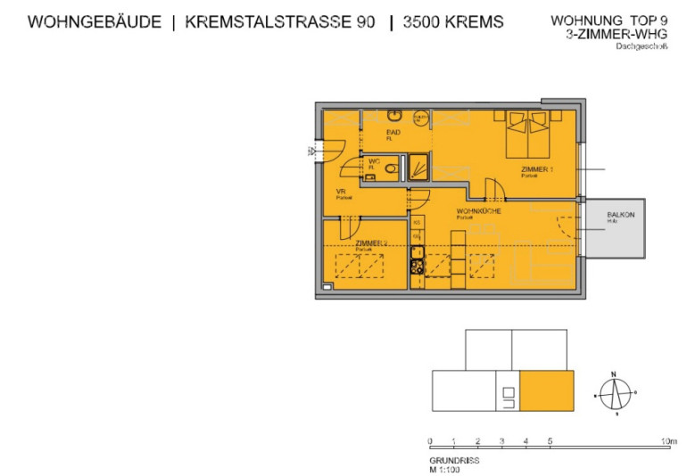Die im DG befindliche Mietwohnung weist eine Gesamtnutzfläche von ca. 77,38 m² auf und gliedert sich wie folgt: Vorraum, Wohnküche, zwei Schlafzimmer, Badezimmer, Balkon und WC.