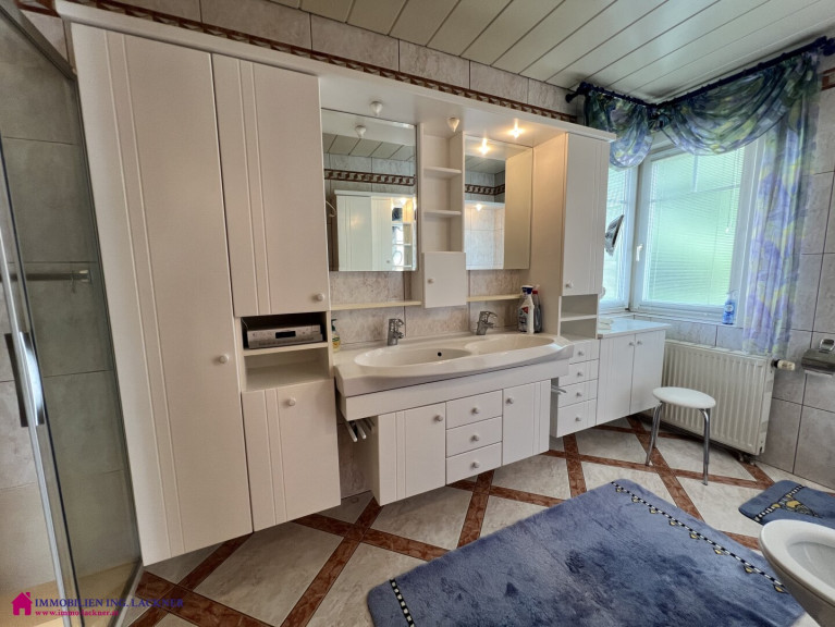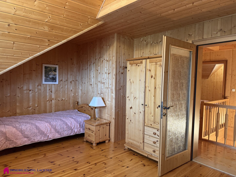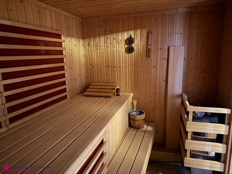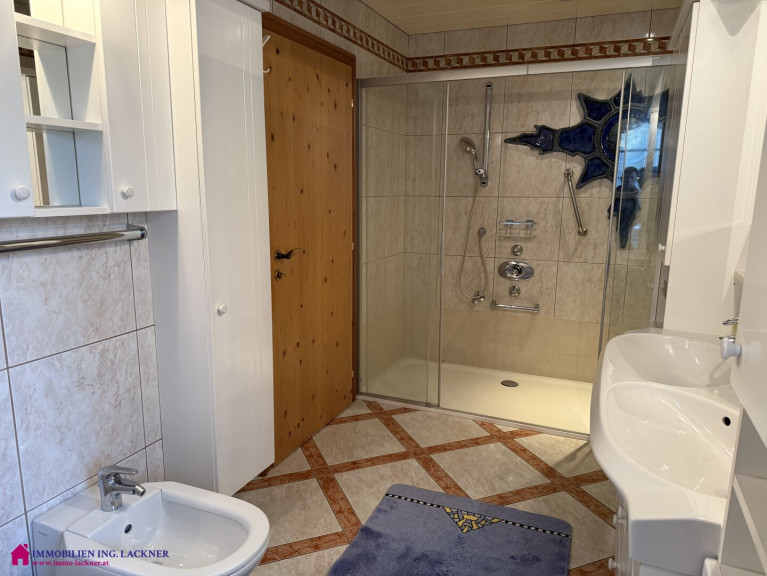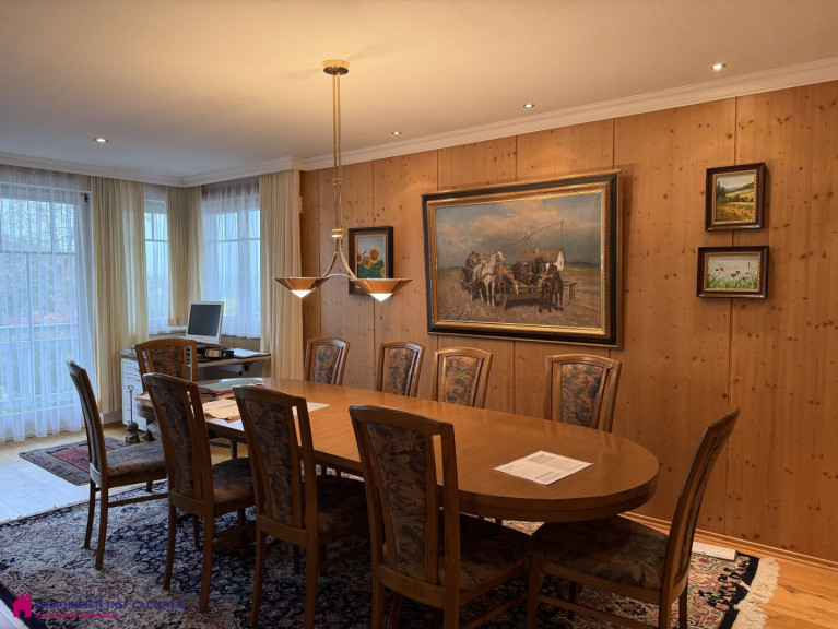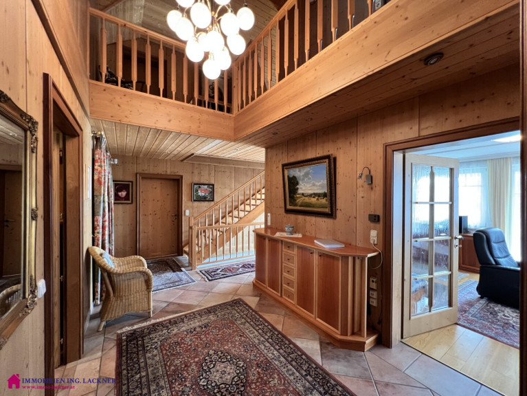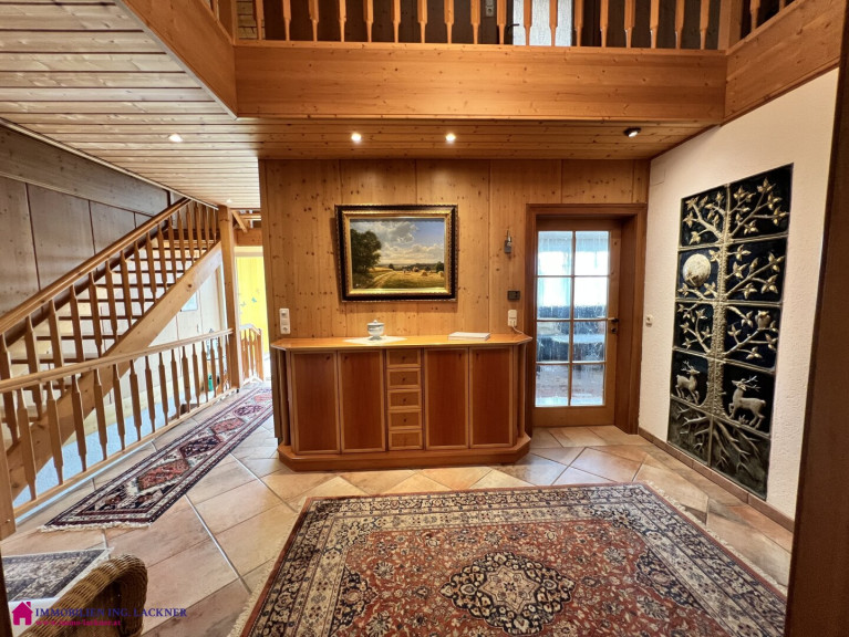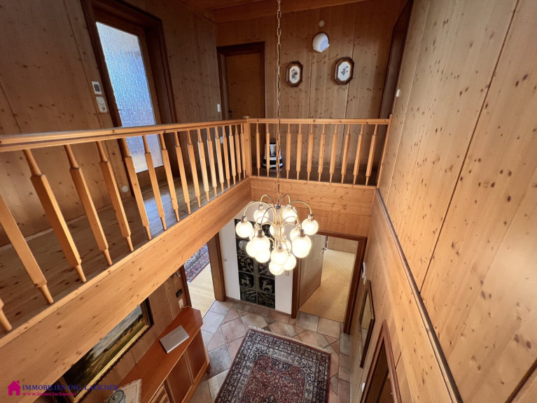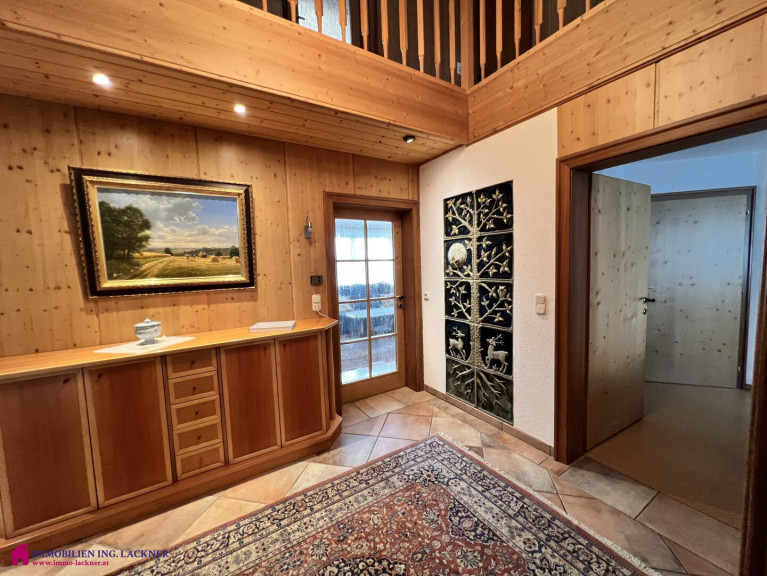 Sie betreten das Haus über einen Windfang und eine kleine Garderobe und gelangen dann in die große zweigeschoßige Diele mit einer umlaufenden Galerie. Von der Dielenebene gelangen Sie in die Küche, den Wirtschaftsraum und die Garage. Der Wohn- und Essbereich ist großzügig gestaltet und bietet einen Ausgang auf Balkon und Terrasse. Auf dieser Ebene befinden sich noch eine große Garderobe, Bad, WC und ein Schlafzimmer. Die restlichen Räume befinden sich im Obergeschoß. Hier steht auch noch eine Ausbaureserve zur Verfügung. Da das Haus in den Hang gebaut wurde teilt sich das Untergeschoß in Wohn- und Kellerbereich auf. Es gibt hier 2 Wohnräume, eine Sauna, sowie Werkstatt und 2 Lagerkeller (Mostkeller) und einen Gartengeräteraum.