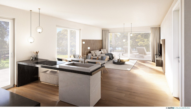 In zentraler Lage und in erster Reihe am See besticht diese 3-Zimmer Wohnung im 1. OG mit lichtdurchfluteten Räumen und raffinierten Blickachsen. Die Top 6 bietet ein geräumiges Wohnzimmer mit offener Küche samt direktem Zugang auf beide Terrassen, zwei Schlafzimmer (mit Terrasse), ein Badezimmer mit Dusche, ein Gäste-WC und einen Abstellraum. Die Wohnung mit bodentiefen Fensterfronten bzw. Terrassentüren samt Terrassen bietet ein Wohlfühl-Erlebnis sowohl im Inneren als auch im Freien. Die Wohnung ist hochwertig ausgestattet. Echtholzparkett verleiht den Räumen zeitlose Eleganz und unvergleichliche Wärme. Große Fensterfronten mit Holz-Alu-Dreifachverglasung versprechen nicht nur beeindruckende Ausblicke, sondern auch optimale Energieeffizienz. Für ein perfektes Raumklima sorgt eine Pellets-Heizung.
