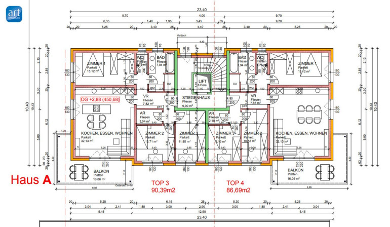 Dielenboden, Fußbodenheizung, Wohnküche / offene Küche, Personenaufzug, Westbalkon, Carport, Parkplatz