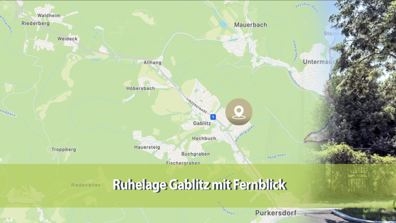 Die Gemeinde Gablitz liegt zirka fünf Kilometer westlich der Wiener Stadtgrenze im Wienerwald in Niederösterreich. Die Fläche der Marktgemeinde umfasst 18,17 km². Davon sind 71,9 % bewaldet. 15 Minuten nach Wien (13/14 Bezirk), 10 Minuten zum Auhofcenter. Busverbindung zu Bahnhof Purkersdorf.